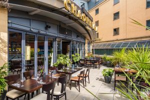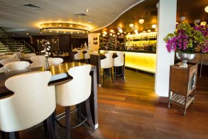 A wide wood, glass and gilt staircase leads to the upstairs and the restaurant’s best kept secret an open air terrace beyond the seating area – just the thing for alfresco dining or to sip a cocktail or two on a balmy evening.