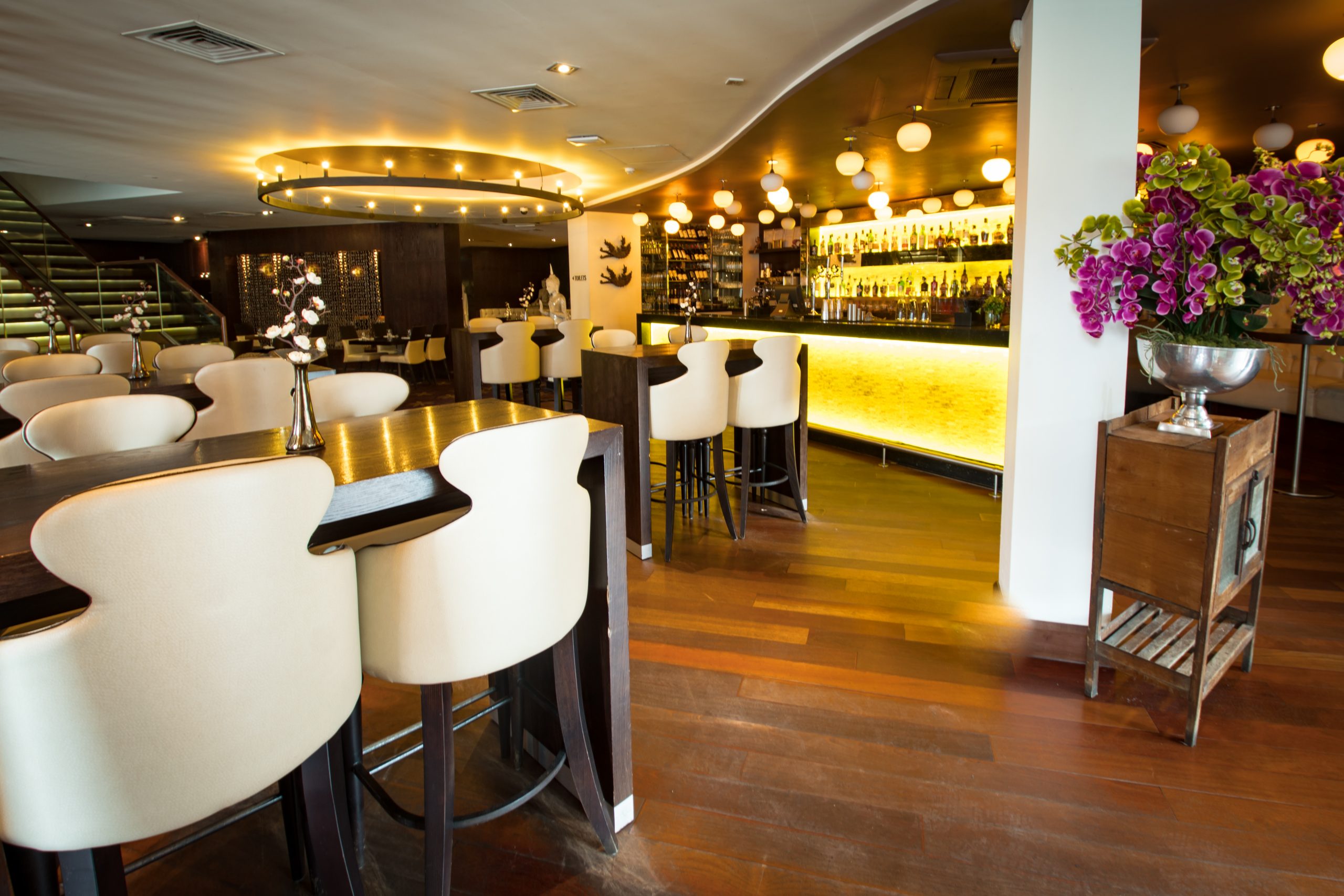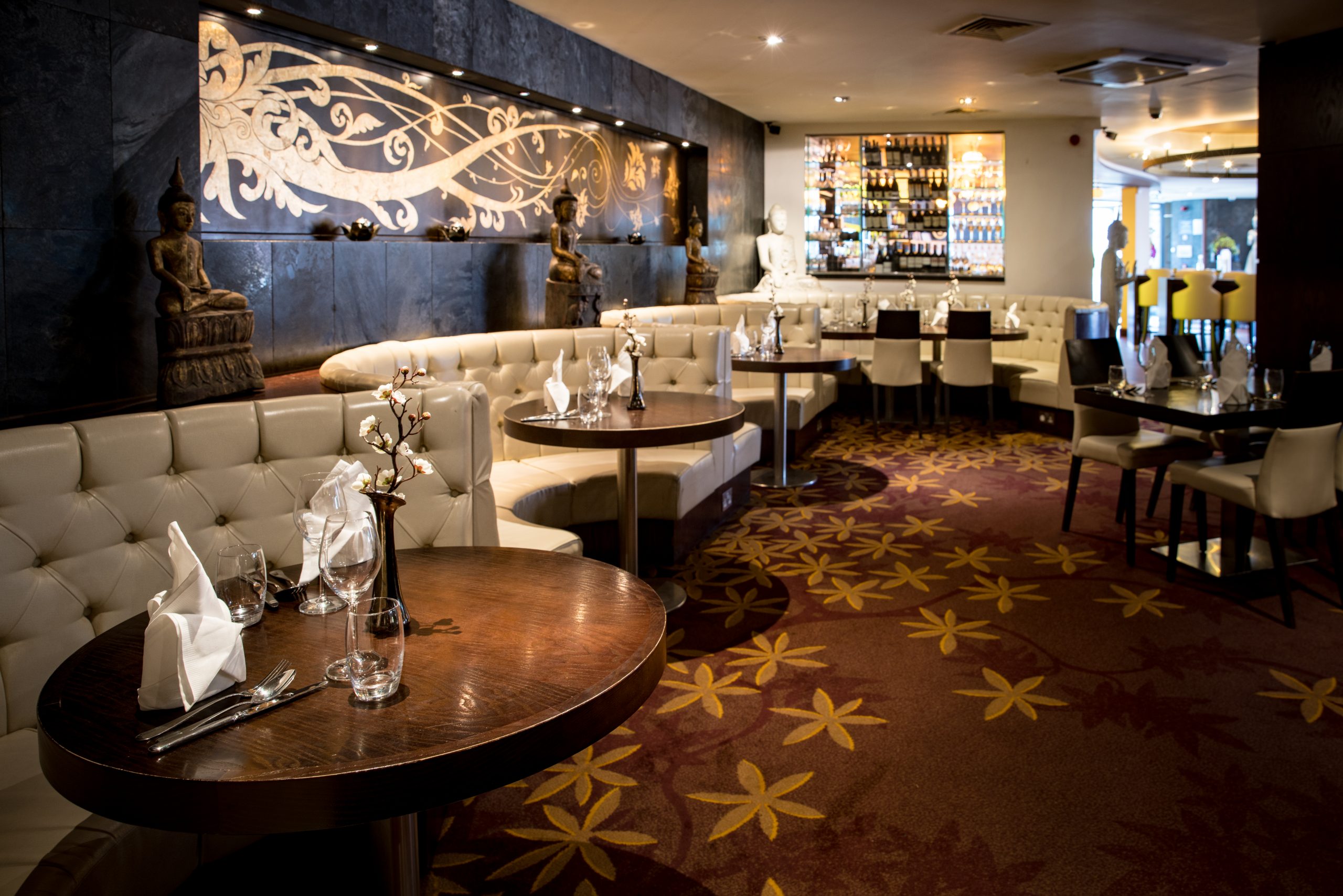 The skilful use of gilt and glass gives the restaurant an opulent air whilst the cream leather upholstery is sheer luxury with wonderful fresh floral decorations re-enforcing the Thai image.
