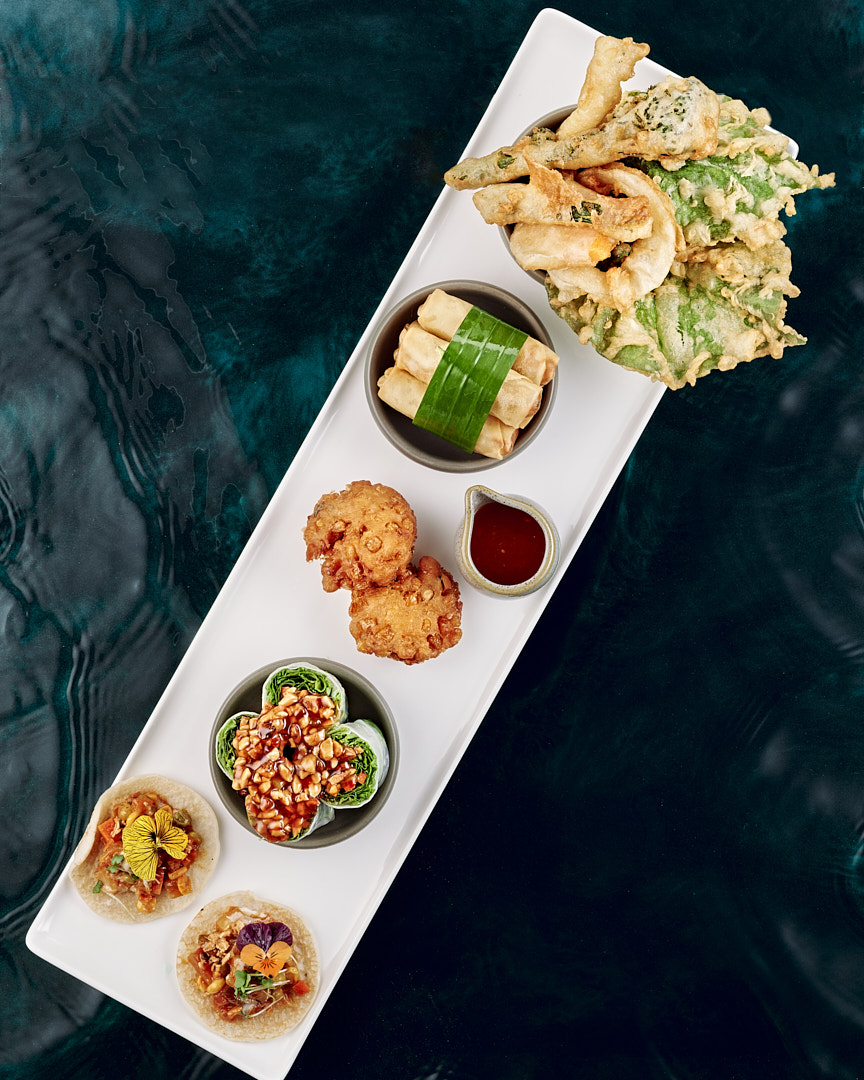 Ted Skarn Jay must have come from the Angel’s Kitchen such was its unusual and deliciously composed flavours. The sweetcorn cakes were coated in a sticky sauce with nuts and were amazing as were the summer rolls so beautifully presented with vegetables rolled into leaves with a very tasty mint dressing with a hint of coriander. On the board there were also crispy vegetable spring rolls, tempura vegetables in a hot and crispy batter and Thai vegetable tacos.