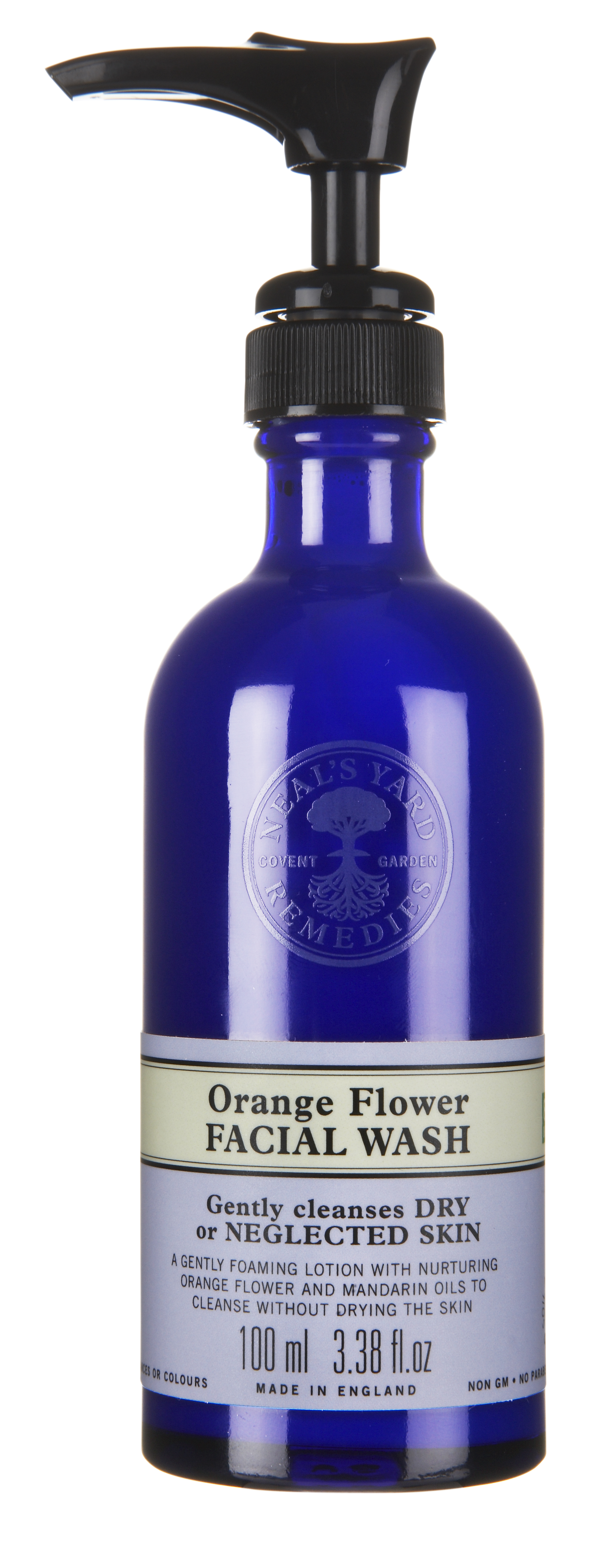 In pump dispensers and in the familiar blue glass bottles Orange Flower Facial Wash for dry and dehydrated skin types. With natural neroli oil, distilled from the blossom of the bitter orange tree, soothing calendula and cooling aloe vera, it washes away impurities and refreshes without drying any further.